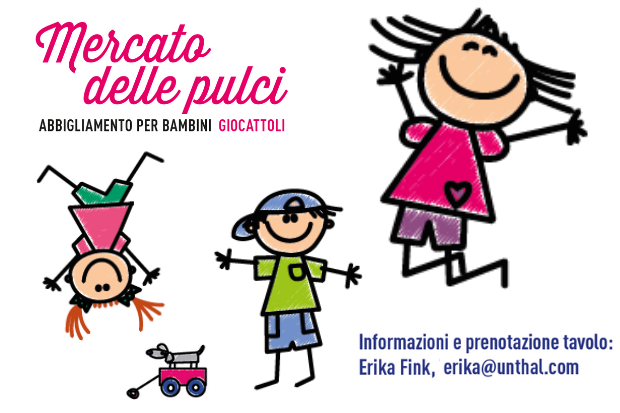 Sabato, 29 novembre 2025, dalle ore 8.30 alle ore 11.30, si terrà un mercato delle pulci per abbigliamento e giocattoli per neonati e bambini presso la Casa Thalguter di Lagundo. Si venderanno abbigliamento e scarpe per tutto l’anno, libri, dvd, cd, lego, playmobil, sci, bici, monopattini, go-kart, seggiolini auto, passeggini e altro. Per informazioni e per prenotare un tavolo scrivete a Erika Fink, e-mail: erika@unthal.com.