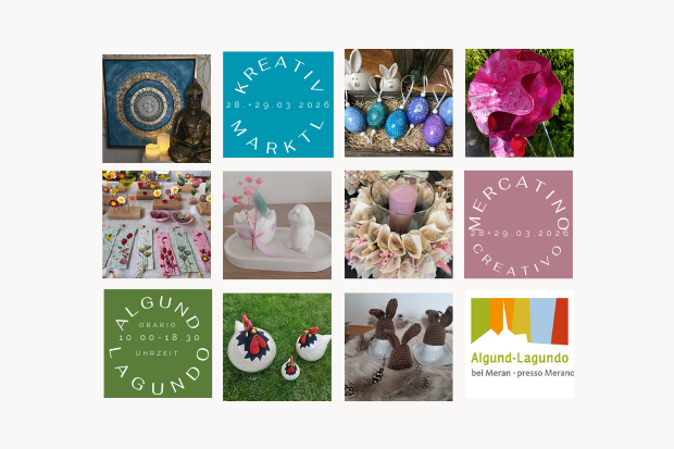 Das Kreativmarktl Algund findet heuer am Samstag, 28. und Sonntag, 29. März 2026 jeweils von 10:00 bis 18:30 im Thalguterhaus Algund statt. Er ist der Geheimtipp für Liebhaber von Selbstgemachtem. Wir erwarten euch zur fünften Osterausgabe des Kreativmarktls Algund! Rund 30 kreative Aussteller*innen, stellen ihre besonderen und originellen Unikate wie handbemalte Ostereier, Osterdeko, Schmuck, Wanduhren, Kerzen, Taschen und Geldbörsen, Grußkarten, Keramik-, Textiles, uvm. zum Verschenken und Dekorieren vor. Außerdem: Kinderecke mit Bastelangeboten und Kinderbuchlesungen. Eintritt frei!