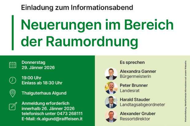 Welche Änderungen bringt die aktuelle Raumordnung mit sich und welche Auswirkungen haben sie auf Gemeinden, Bürgerinnen und Bürger sowie Fachleute? Diese und weitere Fragen stehen im Mittelpunkt des Informationsabends „Neuerungen im Bereich der Raumordnung“, zu dem die Raiffeisenkasse Algund gemeinsam mit der Gemeinde Algund einlädt.